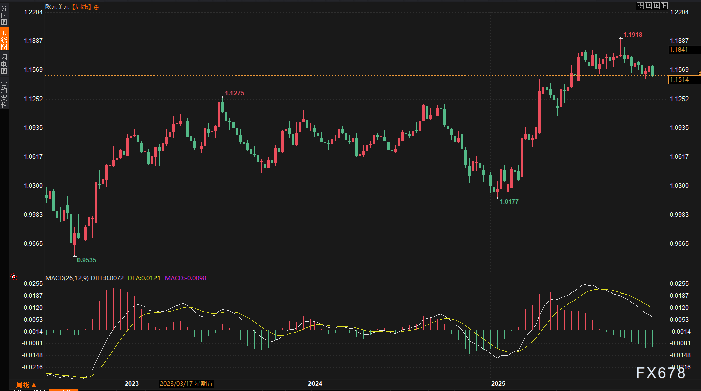 本周走势回顾:欧元兑美元本周走势极其疲软,不仅录得“五连跌”,且周线跌幅达到0.92%,收报1.1527。
