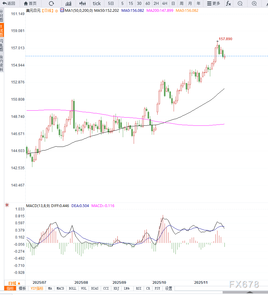 从日线技术面看,USD/JPY的主要趋势仍维持在高位多头结构中,价格运行于关键均线上方,日线指标仍保持正向区间,这意味着短线回调后仍有反复上攻可能。
